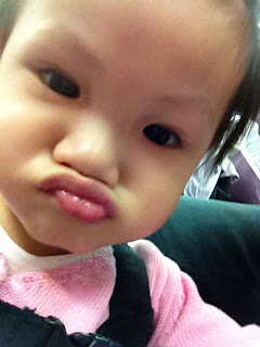 | 回程的航班上,小丫頭一睡醒便這樣嘟起小嘴,非常趣怪! |